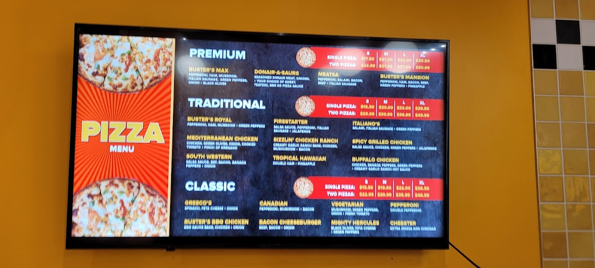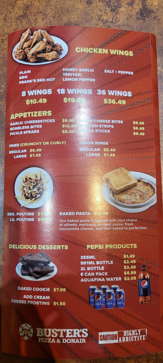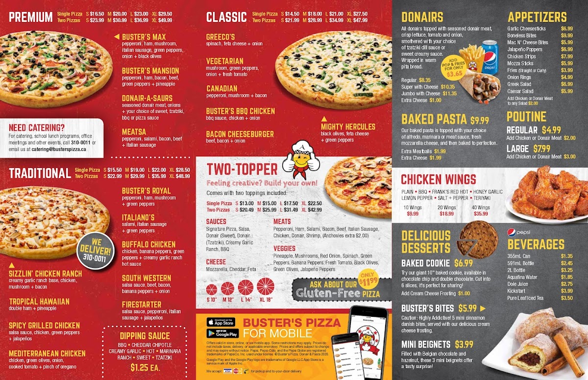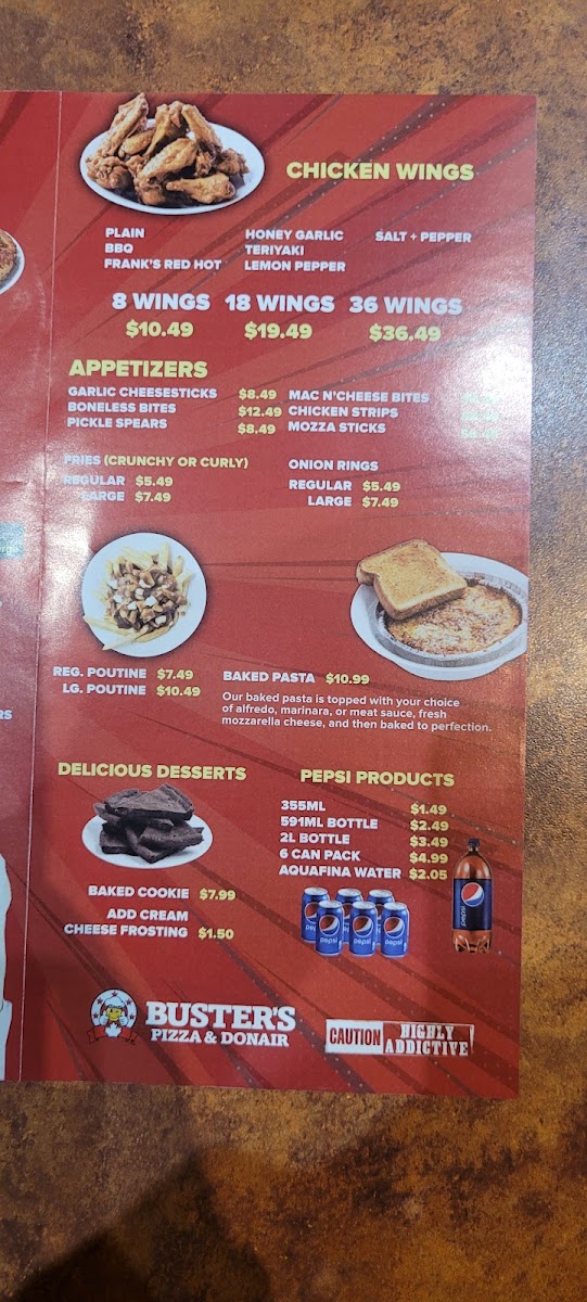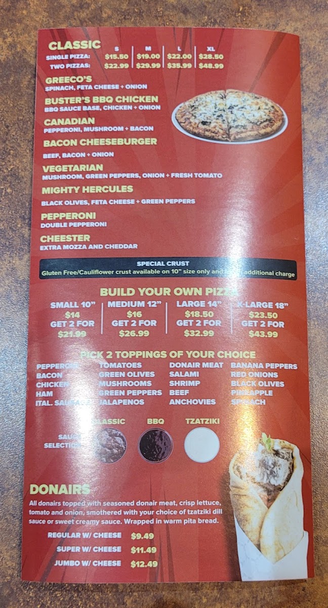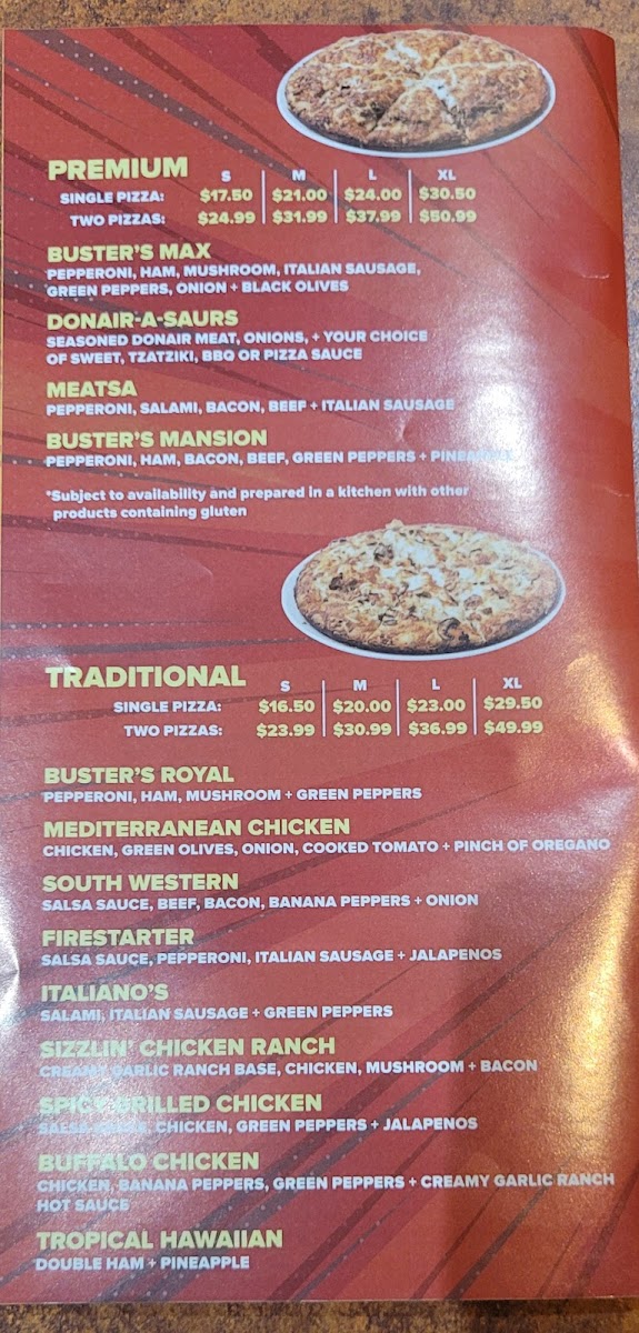 Buster's Pizza & Donair in Edmonton is a vibrant spot where classic pizza meets bold flavors and fresh ingredients. Their menu boasts a variety of mouthwatering pizzas with soft, perfectly baked dough and generous toppings that bring every bite to life. A standout is the Donairasaurus, layered with sweet donair sauce and fresh veggies, offering a delightful twist to traditional pizza.